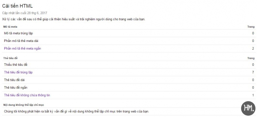 Thông báo và gợi ý giúp bạn cải tiến các vấn đề liên quan đến trải nghiệp người dùng. Như tiêu đề trùng lắp, nội dung mô tả quá ngắn, nội dung mô tả quá dài, Cải tiến HTML trong Google websmaster Tool