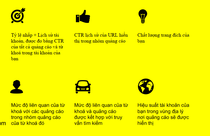 Lưu ý: Tỉ lệ CTR quyết định tới 50% điểm chất lượng, bởi thế nếu muốn tăng điểm chất lượng bạn nên tăng CTR trước.