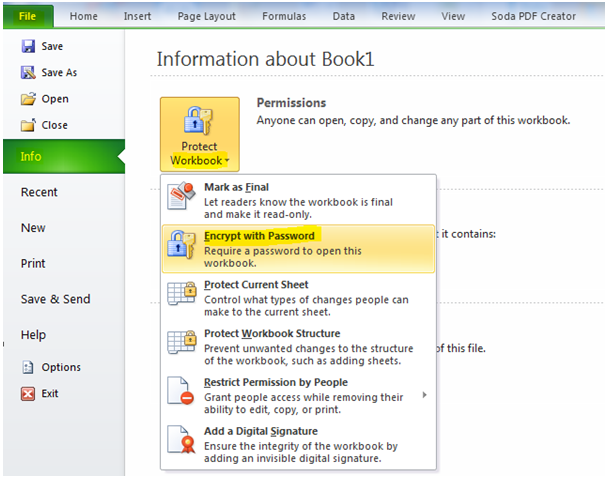 Cách 1: File -> Info -> Protect Wordbook -> Encrypt with Pasword